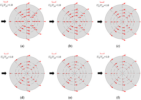 Vectors of the maximum horizontal wind velocities (L = 0.5Djet, rh = 1.0Djet): (a) H/h = 1/12; (b) H/h = 1/6; (c) H/h = 1/4; (d) H/h = 1/3; (e) H/h = 5/12; (f) H/h = 1/2.