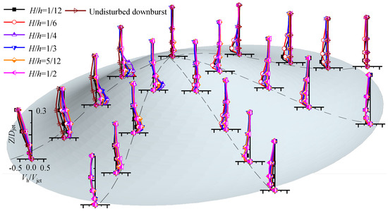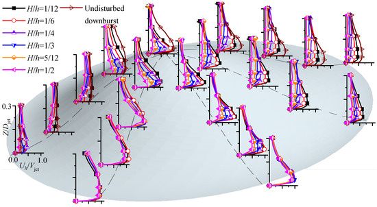 It is worth noting that in the cases surveyed, most of the profiles of the horizontal wind velocity have similar shapes to the downburst profile proposed by Wood et al. [8], i.e., correspondingly with the increase in the relative height from the ground/surface, the velocity increases almost linearly, then rapidly decreases after reaching a peak. Comparatively, the vertical profile of the horizontal wind in the ABL wind (ABL wind profile) usually exhibits an exponential/logarithmic shape. In the cases of high hills, it was found that the shape of the wind profile at the windward side of the x-axis ridge changed from a shape similar to an ABL wind profile to a shape more characteristic of a downburst profile. This phenomenon can be also observed in other cases, e.g., L = 1.0Djet, as shown in Figure 14, Figure 15 and Figure 16. Furthermore, the similarity to the ABL wind profile was usually but not always observed when r/Djet was around 0.5, and occasionally when r/Djet > 1.0 for high hills (H/h > 1/6).