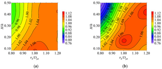 Figure 17 shows the contour maps of the global maximum horizontal velocity, where the conditions under which the speed-up phenomenon occurred can be clearly identified. In the figure, the abscissa represents the hill position, and the ordinate is the ratio of hill height to jet height. The results show that the maximum horizontal velocity occurred when rh was around 1.0Djet. In the cases of the hills with L = 0.5Djet, it was found that a lower hill commonly resulted in a higher wind speed. However, in the case of the hill models with L = 1.0Djet, the maximum of Mt,max was found to be 1.12 when H/h = 5/12.