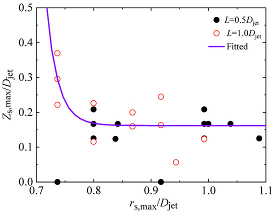 In order to further investigate where a speed-up wind would occur on the hilly terrain, a relative altitude, denoted as Zs, was employed. The relative altitude was designated as the relative height from the hill surface to Z0, the mean altitude of the hilly terrain in the stagnation region, which may be expressed as Zs= z − Z0. For each hill model, the maximum for the relative altitudes in the speed-up region, denoted as Zs,max, was identified and associated with a corresponding radial distance of rs,max from the stagnation point. Figure 18 shows Zs,max versus rs,max. It was found that the average of Zs,max was about 0.166Djet (1.1δ). This indicates that the speed-up would occur at the site with a relative altitude of around/below 0.166Djet, resulting in a more severe downburst wind.