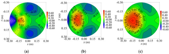 To clarify the impact of the hill position on the maximum vertical wind velocity, Figure 21 illustrates the corresponding contour maps for a typical hill model (L = 0.5Djet and H/h = 0.25) placed at rh = 0.8Djet, rh = 1.0Djet, and rh = 1.2Djet, respectively. These locations of the hill models are around where the strongest near-ground horizontal wind would be observed in a corresponding undisturbed downburst. The three subplots show a similar phenomenon; that is, the upward airflow occurs on the windward side and the downward airflow mainly occurs on leeward side. In addition, correspondingly with the increase in the horizontal distance from the downburst, the vertical wind velocity of the upward flow increased, whereas that of the downward flow decreased. Furthermore, the strong upward flow mainly appeared around the x-axis ridge, whereas the strong downward flow appeared at the hill foot of the y-axis ridges.