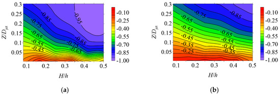 Figure 20 shows the contour maps of the maximum vertical wind velocity. It was observed that both the global maximum vertical wind velocities corresponding to the upward airflow and those corresponding to the downward airflow initially increased with the increase in hill height before reaching a peak value, then decreasing. The peak value for the upward airflow was 0.5Vjet (H/h = 1/4), whereas that for the downward flow was 0.65Vjet (H/h = 1/6). Regarding the downward wind, it was found that the global maximum typically occurred at the leeward part of the x-axis ridge if H/h ≤ 1/6, and at the hill foot of the y-axis ridge if H/h > 1/6. With regards to the upward wind, the global maximum appeared at the windward x-axis ridge if H/h ≤ 1/4, and at the two sides of the hill if H/h > 1/4. These findings again highlight that if the hill is sufficiently high, a circumfluent flow occurs on the sides of the hill.