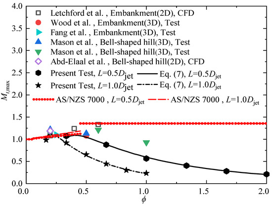 For the Mt,max at the crest, Figure 24 shows the results from the previous research, the curves defined using Equation (3), and the experimental results from the present study. It can be observed that in the case of a small slope (ϕ ≤ 0.45) the results show good agreement. With the increase in the slope, the Mt,max at the crest decreases, whereas AS/NZS 7000: 2010 [29] merely provides a constant topographic multiplier, which results in an excessively conservative design in general. There is a need for formulas that enable a relatively accurate prediction of Mt,max in order to inform a rational design of structures. The discrepancy is largely attributable to the confined nature of the downburst. Moreover, the topographic multiplier defined for an ABL wind, e.g., Equation (4), is not suitable for a downburst wind, particularly in the case of high hills. Regarding the downburst wind, it is worth noting that a relatively higher Mt,max than those illustrated in Figure 24 probably occurs at other locations, as shown in Table 4.