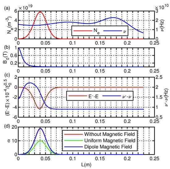In Figure 2c, E denotes the amplitude of the electric field of the propagating wave by considering the dissipation yielded by . is the electric field by considering the dissipation yielded by . The red line indicates the difference between the two. It can be seen that the magnitudes of are only . In addition, according to the blue line, the magnitudes of the damping are , while, according to Figure 2a, the magnitudes of are . In such a case, the collisions are still the dominant cause of signal attenuation in the magnetized plasma sheath. The drift caused by makes little contribution to the signal attenuation. The dipole magnetic field mainly affects the attenuation via its spatial inhomogeneity, which is illustrated in detail in Figure 2d.
