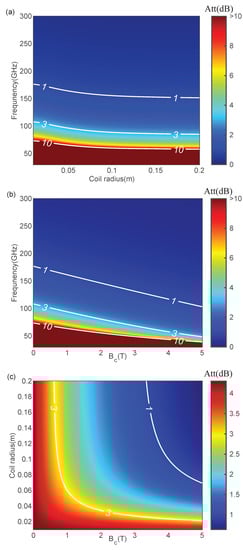 Figure 3c illustrates how the varies with and the radius of the coil when the wave frequency is GHz. As shown in Figure 3c, the decreases with the increase of the coil radius and the . It can be seen that, while is small, the is less affected by the coil radius. The 94-GHz waves obtain a 3-dB absorption coefficient, even if the coil size exceeds 0.1 m; needs to be close to 1 T. This is difficult to achieve for the current onboard magnetic field. Therefore, it is recommended to use 140 GHz as the carrier frequency.