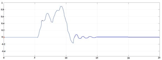 Positive reaction of the herein designed system against a Gaussian speed hump. In this image, the hump is illustrated. It starts at the 5th second and finishes at the 20th second, and the elevation is 15 cm. Notice that the original proposal exhibited an overshoot, but the ulterior improvement canceled this, as well as other undesirable oscillations.