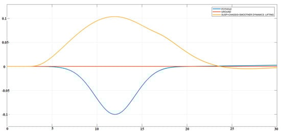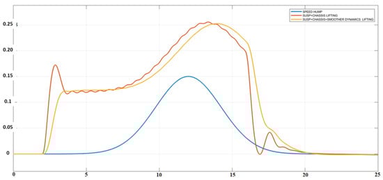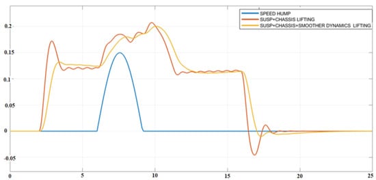 The proposed solution (red) and an ulterior version of it (yellow) could accomplish the task of lifting the car in advance (at Second 2, i.e., 4 s before reaching the bump). Besides, from Seconds 9–16, the car remains up for safety, and the return to its original height transits softly during all the vertical displacement. Notice that the return to its original position (zero level) was performed gently, and the hump was sinusoidal.