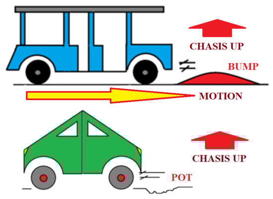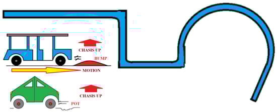 After reviewing all this information, the authors arrived at the conclusion that, in spite of having federal or state laws, which have certainly progressed, in particular in developed countries, it has not been possible to completely regulate the actuation of GCs, LSVs, and PSTs in all environments. In addition, wanting to support the latter, the assistance of speed-control devices was briefly reviewed together with related laws, trying to guarantee a better vehicle–driver performance. However, we also took into account that traffic engineering studies may indicate that these calming devices would be unsafe at certain locations. Thus, a new proposal had to come, and this is an idea that has to be justified. Since the problem of all these vehicles is the driver’s license regulation (which may imply a good/bad person’s development) and given that certain constrained environments retain humps/bumps, it is worth automating the way these carts pass over these speed-control devices. As explained in the Introduction, the herein proposed system will automatically guide a car, and at the moment of arriving at a hump/bump, the car will slow down, then the car’s frame will be elevated above the hump/bump level (to gently transport elderly or handicapped people), and the vehicle will continue its way to the end. From the desired behavior of the suspension system, the following constraints considered for this work are listed: