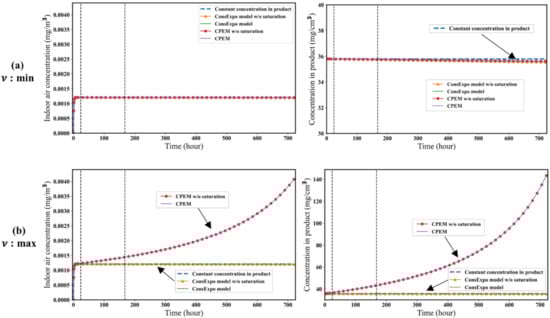 Comparison of the five models in the case where K and S are minimum. The figures on the left show the indoor air concentration of the substance, and the figures on the right show the substance concentration in the product. The dotted lines correspond to 1 day and 1 week, respectively. (a) is minimum value in Table 2. (b) is maximum value in Table 2.