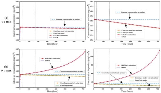 Figure 2 and Figure 3 show the results of simulations with the CPEM and other simplified models using the parameter conditions given in Table 1. When the minimum value of was used, the model assuming a constant concentration of the target substance in the product produced the highest concentration of the target substance in the air. When the maximum value of p was used, the CPEM with and those without saturation kinetics produced the highest concentration of the target substance in the air. The greater the value of p, the greater the concentrations of the target substance in the product and air. There was no significant difference between the CPEM and ConsExpo evaporation model when the lowest of the measured p values from the 20 products was used. This is because the change in product mass was insignificant, and there was no significant difference in the concentration of the target substance in the air between the ConsExpo evaporation model and CPEM. If the evaporation rate of the substance per unit mass of the product was faster than , the concentration of the substance in the product decreased, as in the ConsExpo evaporation model. However, as increases, the product mass decreases rapidly, and therefore the concentration of the target substance in the product increases, with a consequent increase in the concentration of the target substance in the air.