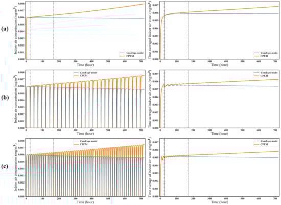 Comparison of the target substance concentrations in the air under different ventilation conditions. The graphs on the left show the air concentrations of the target substance, and the graphs on the right show the time-averaged concentration of target substance in the air over 1 month. The simulation parameters are presented in Table 1. (a) No active ventilation, (b) active ventilation once a day, and (c) active ventilation twice a day.