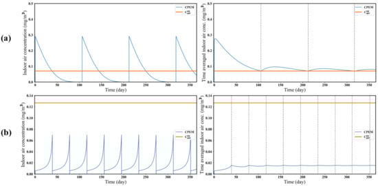 Figure 4 shows a comparison of the results obtained for the CPEM and ConsExpo models under three active ventilation scenarios. The differences in the concentrations of the target substance in the air continuously increased during the period of use. Even with active ventilation, in the CPEM, the concentration of the target substance in the air increased as the mass of the product decreased over time. The more frequently active ventilation was conducted, the more frequently the substance was removed from the air, and the average concentration decreased. It can be seen that the time-integrated average concentration of target substance in the air with active ventilation once a day (Figure 4b) is higher than with active ventilation twice a day (Figure 4c).