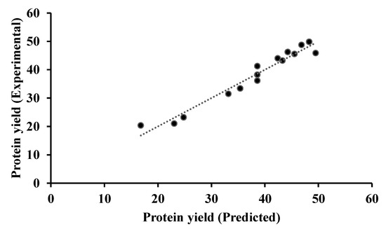 The analysis of variance (ANOVA) showed that the regression model was statistically significant at a confidence level of 95% (p < 0.05) with a value of 0.9315 for the determination coefficient, indicating that 93.15% of the variability in protein yield could be predicted by Equation (4). Further, the interactions between independent variables were very strong and were also statistically significant (p < 0.05) (Table 5).