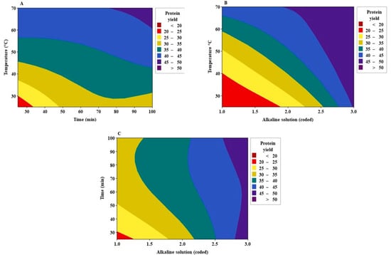 As mentioned before, the values of the alkaline solution were coded as 1, 2, and 3, with pH values of 12.10, 12.29, and 12.68, respectively (Table 3). For every temperature, the response increased consistently when increasing pH value and vice versa. The pH strongly influenced protein extraction, even at a temperature as low as 30 °C with a pH value of 12.68, the response was 45–50% (Figure 3B). In the case of the time and alkaline solution interaction, the protein yield improved for all the times when increasing the pH value. It was observed that, at a pH of 12.68, a maximum response was achieved regardless of time level (Figure 3C).