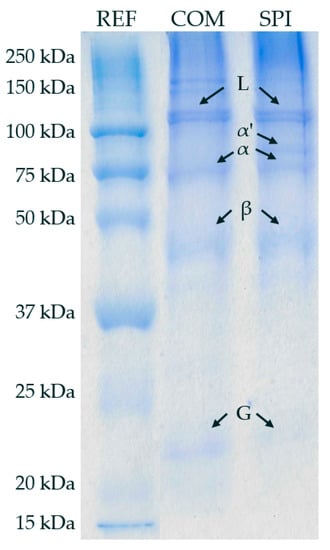 SDS-PAGE analysis of SPI and commercial SPI (COM) is shown in Figure 4. Both samples exhibited a similar electrophoretic profile, showing bands with molecular weight ranging from ~110 to ~23 kDa. Soy proteins mainly consist of albumins and globulins, and ~90% correspond to fractions 7S (β-conglycinin) and 11S (glycinin), which are globulins. Fraction 7S contains the subunits α’, α, and β with a MW of 72, 68, and 52 kDa, respectively, while fraction 11S contains two subunits with a MW of 35 and 20 kDa [].