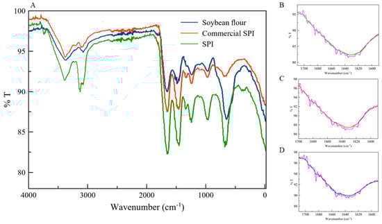 FTIR spectra of soybean flour, commercial SPI, and obtained SPI (A); deconvolution of obtained SPI (B), deconvolution of commercial SPI (C), and deconvolution of soybean flour sample (D).