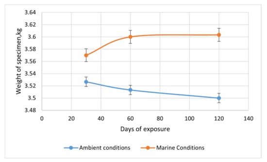 | Days of Exposure | Weight of Specimens, kg | Percentage change in weight between 28-day value and ambient conditioned samples (%) | Percentage change in weight between 28-day value and marine conditioned samples (%) | Percentage change in weight between ambient and marine conditioned samples (%) | ||