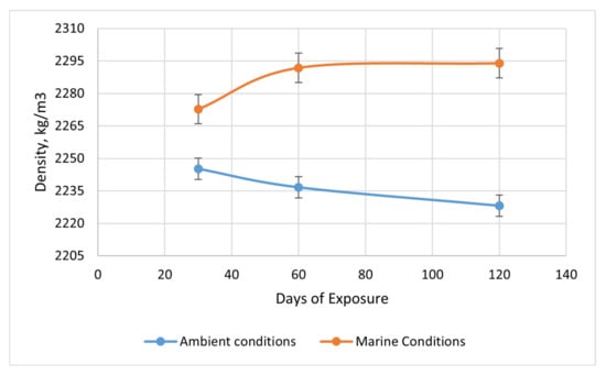| Days of Exposure | Density, kg/m3 | Percentage change in weight between 28-day value and ambient conditioned samples (%) | Percentage change in weight between 28-day value and marine conditioned samples (%) | Percentage change in weight between ambient and marine conditioned samples (%) | ||