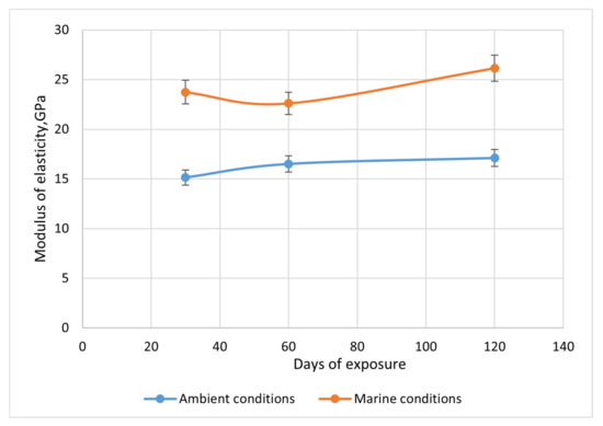 | Days of Exposure | Modulus of Elasticity, GPa | Percentage change in weight between 28-day value and ambient conditioned samples (%) | Percentage change in weight between 28-day value and marine conditioned samples (%) | Percentage change in weight between ambient and marine conditioned samples (%) | ||