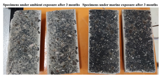 - Zaidi, F.H.A.; Ahmad, R.; Abdullah, M.M.A.B.; Tahir, M.F.M.; Yahya, Z.; Ibrahim, W.M.W.; Sauffi, A.S. Performance of Geopolymer Concrete when Exposed to Marine Environment. IOP Conf. Series: Mater. Sci. Eng. 2019, 551, 012092. [Google Scholar] [CrossRef]