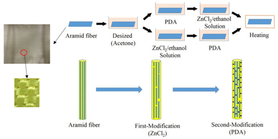 In order to remove dust and oil fabrics were immersed in acetone for ten minutes and added to ZnCl2 ethanol mixed solution and modified in 0, 2 wt%, 4 wt%, 6 wt%, 8 wt% and 10 wt% concentrations and 0, 2 h, 4 h, 6 h, 8 h, 10 h and 12 h treatment times. After modification, the aramid fibers were taken out of the solution and washed three times with distilled water. Next, the aramid fiber was added to the prepared PDA solution, shaken for 24 h and dried at room temperature.