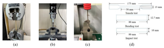 Figure 2. Mechanical properties test and specimens. (a) Tensile test, (b) Bending test, (c) Impact test and (d) Specimens picture.