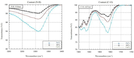 Figure 4 shows the FT-IR analysis graph of the three kinds of Lewis acid surface modifications—AlCl3, CaCl2 and ZnCl2. At wavenumbers 1637 cm−1 and 3310 cm−1, we can see the expansion of the vibration peak of C=O (amide I band) and N-H bonds. The chemical composition of the aramid surface was significantly changed after treatment with a Lewis acid ethanol solution. Among three kinds of Lewis acid AlCl3, CaCl2 and ZnCl2, the content of N-H and C=O bonds with ZnCl2 treatment was 3~4% and 5~10% higher than AlCl3 and CaCl2, respectively. The lower transmittance means the higher content of chemical bonds. The N-H and C=O bonds obtained the lowest transmittance under the ZnCl2 treatment condition. It proves that the ZnCl2 treatment was successful in improving the aramid fiber surface modification because of the high content of N-H and C=O bonds were obtained. Therefore, the ZnCl2 treatment is the best condition in three kinds of Lewis acid surface modifications.