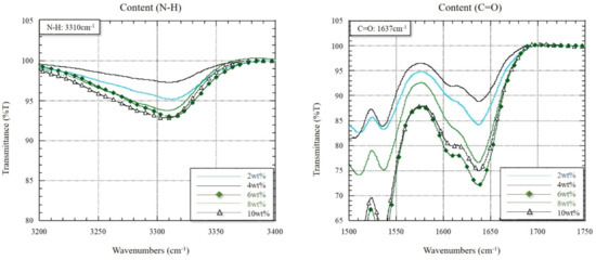An FT-IR spectrometer (Frontier, Perkin Elmer, Waltham, MA, USA) equipped with an attenuated total reflectance (ATR) UATR reflection accessory was used to determine the chemical bond content of N-H and C=O. The spectra were recorded in the 500–4000 cm−1 range with a resolution of 0.4 cm−1 to 64 cm−1.