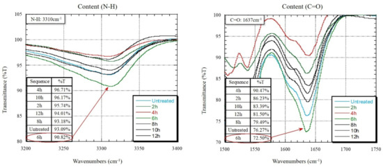 The modification of the ZnCl2 treatment to aramid fibers is determined by the content of active groups, such as N-H and C=O. The concentration and treatment time of the ZnCl2 treatment are important conditions that affect the content of active groups, such as N-H and C=O. Figure 5 and Figure 6 show the results of FT-IR analysis under various concentration (weight ratio) conditions of 2, 4, 6, 8 and 10 wt% and processing conditions of 0, 2 h, 4 h, 6 h, 8 h, 10 h and 12 h. As a result of observing the peak values of the N-H and C=O bonds under the conditions of 2~10 wt% concentration at both wavenumbers 3310 cm−1 and 1637 cm−1, the transmittance showed a waveform shape as the concentration increased. Among them, the peak values appeared at 6 wt% and 10 wt%, respectively. Under the treatment of 0~12 h treatment time, the peak value obtained the lowest content of 72.5% by 6 h treatment conditions. The transmittance is 90.82% of the N-H bond and 72.50% of the C=O bond. This is 6% and 18% lower than the 4 h treatment condition, respectively. The content of N-H bonds increased with concentration, but the C=O bonds did show an increasing trend up to 6 wt% and a decreasing trend thereafter. At different treatment times, it also showed an increase in the content of N-H and C=O bonds as the treatment time approached 6 h. This phenomenon may indicate that the contents of N-H and C=O bonds do not increase with time and concentration but rather in a waveform growth manner. So that peak of the maximum increase was found by FT-IR. Additionally, this peak is the position described earlier. Therefore, two concentrations of 6 wt% and 10 wt% and 6 h treatment time were the most beneficial conditions.
