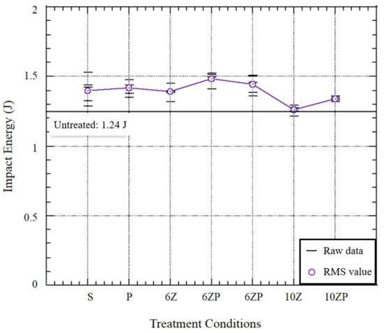 Figure 7 shows the impact energy of aramid fiber-reinforced polymer (AFRP) composites by ZnCl2 and PDA treatment. The untreated composites showed impact energy of 1.24 J. The highest impact energy of 1.52 J was obtained in the 6ZP condition, which is 20.17% higher than untreated. Compared to the untreated, the impact energy was improved by all single-treated conditions such as S, P, 6Z and 10Z. This is consistent with the evidence that the surface treatment can improve the performance of the composite material by increasing the adhesion between the fabric and the resin. Comparing the impact energy of the 6PZ, 6ZP and 10ZP hybrid treatment conditions and the 6Z and 10Z single treatment conditions, the hybrid treatment further improved the impact energy by 8%. The ZnCl2 treatment etched the surface of the aramid fiber and improved the roughness. The functionalization of the fabric surface was further improved through PDA treatment. The hybrid treatment improves the interfacial adhesion between the aramid fiber and the epoxy resin. Therefore, the best impact energy was obtained by 10ZP, which implements the PDA treatment after ZnCl2 treatment. The impact energy by PDA-ZnCl2 treatment was lower than ZnCl2-PDA treatment. Because in the PDA-ZnCl2 treatment condition, dopamine adhered to the fabric surface is washed away, which may reduce performance.