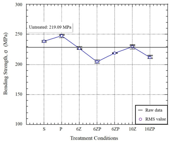 Figure 8 shows the bending strength of AFRP composites by ZnCl2 and PDA treatment. In untreated conditions, the bending strength of the AFRP was 219.09 MPa and the best bending strength was obtained by P condition (247.85 MPa, increased by 13.13%). As a result of the single-treated conditions that were treated by S, P, 6Z and 10Z, the bending strength improvement trend for aramid fiber composites was P ≥ S ≥ Z. ZnCl2 treatment obtained the lowest improvement in bending strength among the three treatments. Because ZnCl2 treatment can improve bonding ability with resin by giving an etching effect to the aramid fiber surface, the performance improvement rate is reduced by lowering the performance of the fabric itself. Hybrid treatment conditions showed overall performance degradation. Among them, condition 6ZP obtained lower bending strength than condition 6PZ. Under the same hybrid treatment sequence condition, the 10ZP condition with a high ZnCl2 concentration can obtain higher bending strength than the 6ZP condition. Therefore, in the hybrid condition, the bending strength is in the order of 6PZ ≥ 10ZP ≥ 6ZP.