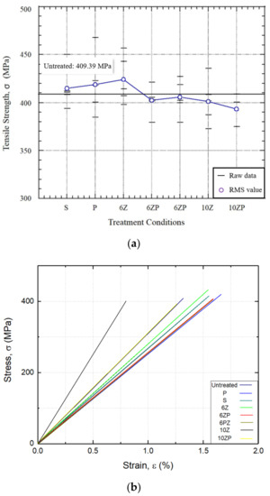 Figure 9 shows the tensile strength of AFRP composites by ZnCl2 and PDA treatment. The tensile strength of the untreated condition was 409.39 MPa, and the highest tensile strength was obtained in the 6Z condition (423.74 MPa). This is a 3.51% improvement over the untreated 409.39 MPa. Similar tensile strength improvements were obtained under all treatment conditions. The highest tensile strength was obtained under 6Z conditions, and the lowest tensile strength was obtained under 10ZP conditions. Additionally, the difference between these two conditions is less than 5%. Tensile strength is related to the performance of the fabric itself. Lewis acid treatment weakens the fabric itself by etching the fabric surface, reducing the performance of the composites. However, etching can increase the surface roughness of the fabric and improve the interfacial adhesion between the fabric and the epoxy resin, thereby improving the performance of the composites. It is judged that there is no change in tensile strength as the two phenomena are canceled out.
