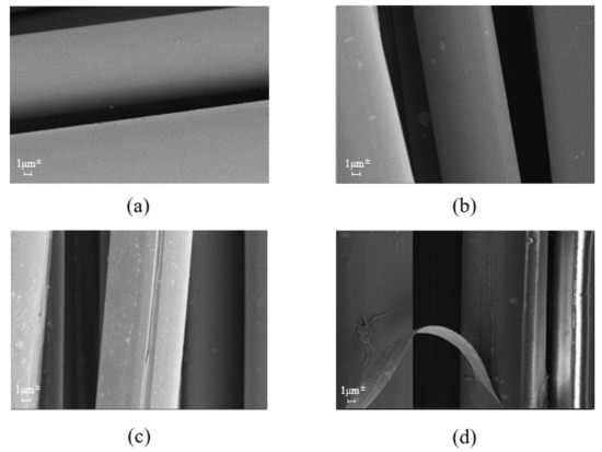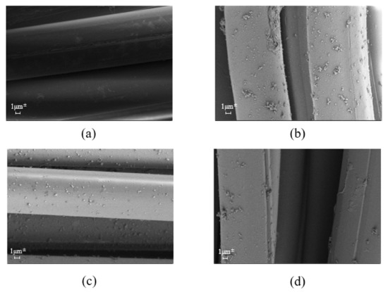 Figure 11 shows a ZnCl2-treated SEM image on the surface of the fiber. Comparing the conditions of (a) and (b), the material treated on the fiber surface under condition (b) was remarkably observed. This proves that PDA was coated on the fiber surface under condition (b). The difference between (b) and (c) is the difference in the treatment order of polydopamine and ZnCl2. The amount of PDA adhering to the surface in condition (c)was smaller than condition (b). Because dopamine could be drained in the process of ZnCl2 treatment if the processing order is ZnCl2 first and then PDA. In (b) and (d), the fiber surface etching phenomenon of the high concentration (d) condition is more pronounced than the low concentration (b) condition. It can be seen that the concentration affects the degree of fiber surface treatment. However, the fiber surface under condition (d) has a high etching effect, and the fiber itself may be damaged, resulting in a decrease in performance.