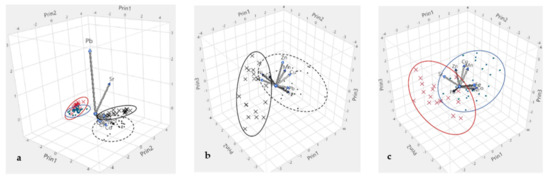 PC1 in Table 8a indicates the dominant element concentrations. Large loadings for Cr, Cu, Mn, and Sr prove that concentration effects are strong. PC1 in Table 8b,c can be interpreted as the indicator of anthropogenic sources for these elements, while PC2 suggests a lithogenic origin of the elements with high loadings.