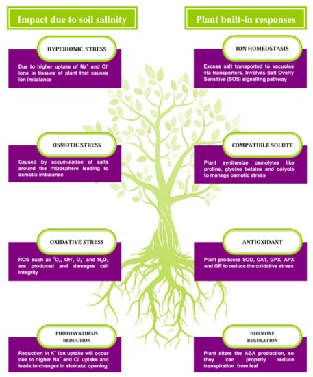 One of the biggest abiotic factors impacting global agricultural productivity is salinity stress. Salt-induced conditions such as osmotic imbalance and ion toxicity when plants are exposed or grown in salt affected environments are referred to as salinity stress (syn: salt stress). By 2050, salt-affected regions are predicted to encompass about half of the total agricultural land [1]. Soil salinization refers to the excessive presence of soluble salt ions such as sodium, bicarbonate, magnesium, sulphate, potassium, chloride, calcium, and carbonate. Salinization is measured via the electrical conductivity (dS/m) of the soil [2]. When the electrical conductivity of the saturation extract (ECse) of the soil is 0–2, 2–4, 4–8, 8–16, and >16 dS/m, it is categorized as non, slightly, moderately, very, and extremely saline soil, respectively (USDA). One dS/m is approximately equal to 10mM of sodium chloride. The majority of cultivated plant species, particularly widely established horticultural and cereal crops, are glycophytes, which means they are sensitive to high concentrations of dissolved ions in the rhizosphere solution (e.g., >30 mM or >3.0 dSm−1). Soil salinization has a number of negative consequences to glycophytes including induced physiological and biochemical malfunctions, nutritional and different secondary (e.g., oxidative) disorders [3], as well as a reduced crop productivity, depending on salt concentration, exposure time, crop developmental stage, and environmental conditions (e.g., temperature, humidity, soil moisture, etc.). Soil salinization results in a combination of salt-induced multiple stresses cumulatively affecting plants. The reduced nutrient mobilization, hormonal instability, generation of reactive oxygen species (ROS), ionic toxicity, and osmotic stress all contribute to reduced plant development under salinity stress (Figure 1).