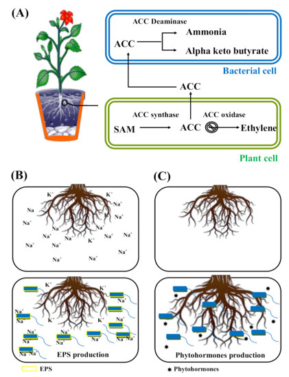 Bacterial metabolite mediated mechanism for minimizing salt stress in order to boost plant growth and development. (A) The ACC deaminase enzyme, (B) EPS production, and (C) Phytohormones production. SAM (S-adenosyl-L-methionine); ACC (1-Aminocyclopropane-1-Carboxylic Acid); EPS (Extracellular Polymeric Substances). Top plane of (B,C) are without bacterial cell and bottom plane is with bacterial cells.