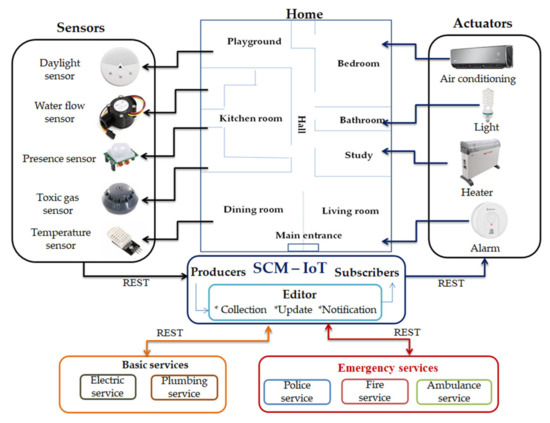 In IoT, particularly home automation, sensors and actuators are identified respectively with producers and subscribers. Producers originate the data to update the book by intermediation of the editor. Subscribers receive notifications from the editor about the logical conditions that are satisfied with the notebook’s contents. Thus, an application in IoT develops an observable behavior for the data flow, as a data flow that transits from sensors to actuators. The editor act as a broker that uses the notebooks for data reception, transformation, and further notification. SCM-IoT simplifies the scheduling of activities since the interactions between participants are generally very complex. In SCM-IoT, sensors and actuators are grouped by the topic of environmental variable they are intended to deal with. Among the topics often used in domotic applications are, for example, human presence detection, temperature, humidity, or light intensity.