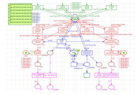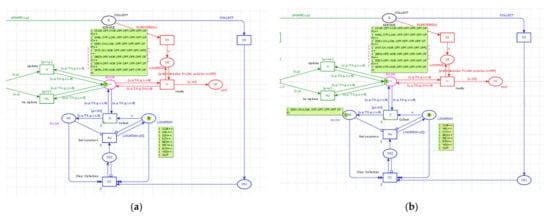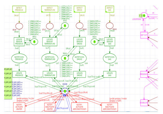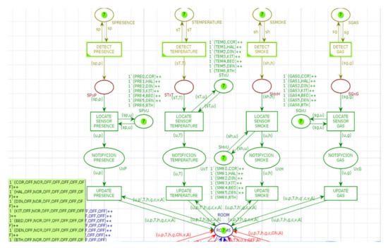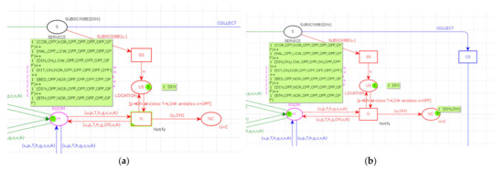 The update service modifies the notebook’s contents, but only on one page and one field at a time. This service is represented by the structural pattern given by the CPN marked in green as shown in Figure 2a,b. The request originates from the service request place S with the token “UPDATE (COM, SI)” indicating to make the update in the page identified by “COM” for the field “PRESENCE” with the value “YES”, meaning that someone is in the dining room as shown in Figure 2a. This request is left in place “P” where the presence update requests are attended.