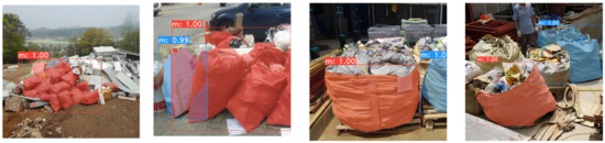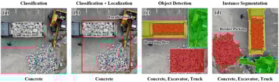 Object detection is a method to detect several objects in an image and show the object’s location with a bounding box (Figure 1c). It is possible to advance this method by increasing the intersection-over-union (IoU), which can generate more object proposals and distinguish object rotation, within-class diversity, and between-class similarity [50,51]. A function to differentiate several objects simultaneously was added to this method, making it suitable to classify waste; however, since it shows the location in a box shape, a human may find it difficult to assess if several objects are complexly mixed. In addition, the method aims to identify fixed set objects around human beings, making it inadequate to recognize atypical construction waste. Lastly, instance segmentation identifies several objects detected through object detection in the pixel unit according to the boundaries of each shape and indicates this by masking (Figure 1d). The masking effect makes this suitable for this study since construction waste that is tangled and overlapped can be identified, and the user can identify the object location and type intuitively.