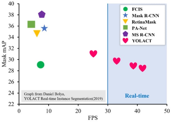 As indicated in Figure 2, the comparison results of the two-stage instance segmentation model and YOLACT show that the algorithm processing speed of YOLACT, which predicts the mask in parallel in one-stage instance segmentation, was much faster. Moreover, by utilizing the YOLACT model, the masks were predicted in more detail than with the other instance segmentation models [17]. Thus, YOLACT is considered suitable to learn the model in real time, precisely predicting objects, and thus was chosen as the development model in this study.