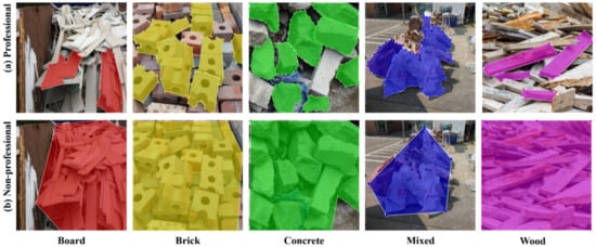 Labeling by users: (a) labeling by professional for five types of construction waste; (b) labeling by non-professional for five types of construction waste.