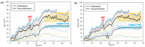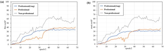 mAP of the AI model trained with the augmented dataset: (a) mAP of box; (b) mAP of mask.