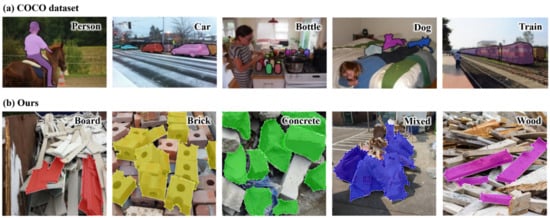 Comparison of labeling for each dataset: (a) the MS COCO dataset; (b) the construction waste dataset.