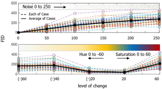 The research increased the quantity of learning data in two ways, with noise and hue, considering the following phenomena: firstly, it was thought that surface texture would differ depending on noise; secondly, it was considered that the level of a color change would depend on the sunlight when outside or lighting when indoors, and would lead to different waste categorizations; thus, we chose two augmentations. The level of image adjustment was numerically compared with the FID in the original and generated data after deforming the images in steps, as shown in Figure 7 [37]. In order to assess the optimal level, every 50 wood classes were deformed and compared, and as a result, the optimal level was under 100 for Gaussian noise and under −20 for hue. On the basis of the results, augmentation was conducted, and a total of 1198 additional images were acquired. After being augmented in this way, the data were equivalent to three times the size of the existing data, and so the number of iterations was also tripled for transfer learning (30,000 iterations), making it able to learn in the same number of epochs as in previous cases. Figure 8 shows the results after additional transfer learning with the same model by augmenting the color and texture, considering the characteristics of construction waste, and increasing the data quantity in order to verify the argument stated above.