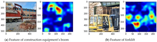 An example of Grad-CAM in which an AI model that recognizes construction equipment can visually check the feature range of an object: (a) As a result of Grad-CAM for a piece of construction equipment’s boom, the model could identify construction equipment’s boom; (b) As a result of Grad-CAM for a forklift, the model could identify feature of forklift.