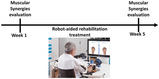 As reported in Figure 1, each patient carried out a robot-aided rehabilitation treatment with the Gloreha Sinfonia, composed of five sessions per week for 4 weeks. At the beginning and at the end of the course of treatment with robot (i.e., before rehabilitation and after rehabilitation, BR and AR, respectively), sEMG signals were recorded from injured and healthy hand, by using the Delsys Trigno EMG wireless system, in order to extract muscular synergies of each subject and evaluate patient rehabilitation outcome. Moreover, each subject was evaluated using Fugl–Meyer motor assessment of the upper extremity (FM) and motor power (MP) assessment before and after the therapy program with the Gloreha robot [31,32].