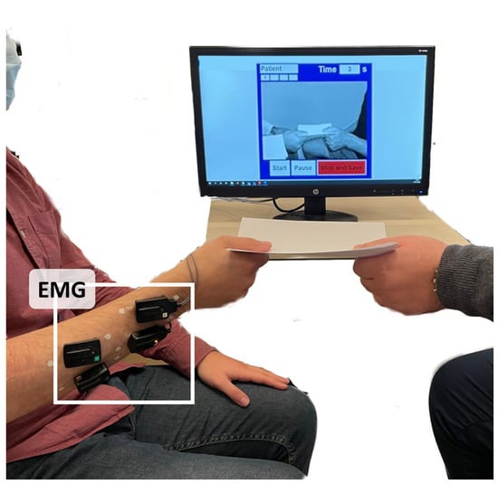 As showed in Figure 2, the recording of the EMG signals was performed with the patient sitting in a comfortable position, in front of a screen that showed him/her the grip to perform. The subject performed four different grasps selected randomly, shown by means of a purposely developed user interface and performed similarly to the FM assessment. He/she had to grab and hold the following objects: a can, a pencil, a sheet, and a tennis ball (Figure 3). The subjects were required to perform the grasp and to hold the object for ten seconds, followed by a pause of at least ten seconds. The sEMG data were recorded during the ten seconds of grasp execution. The subjects were asked to perform the same task with the injured limb before and after rehabilitation treatment (BR and AR) and subsequently with the healthy limb in order to obtain the healthy muscle patterns (H), i.e., a comparison term for each subject. Furthermore, at the beginning and at the end of the treatment, the subjects were assessed by means of the FM and MP scales to evaluate the performance through clinical validated tools.