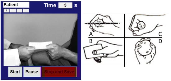 The adopted user interface is reported on the left. The therapist can use the buttons in the bottom to start the timer, pause it, and to stop and save the data. The tasks performed by the patient are reported on the right: grasp a pencil (A), grasp a sheet (B), grasp a small can (C), and grasp a tennis ball (D).