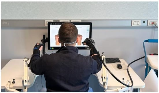 The Gloreha Sinfonia (Figure 4) is a robotic exoskeleton for robot-aided neuro-rehabilitation of the hand. It is composed of a motorized glove for hand mobilization driven by five permanent magnetic actuators (LA12 Actuator, TECHLINE). The cable actuation of the glove allows placing motors distant from the patient and to administer the therapy in total safety for him/her. The motors are, in fact, positioned in a mobile box. Furthermore, the Gloreha Sinfonia is equipped with a second glove that is not actuated, but equipped with five bend-sensors (Flexpoint Inc., West Jordan, UT, USA) to detect the movement of the healthy limb (i.e., of the corresponding finger) and replicate it on the injured limb. Both gloves are connected to the PC via USB cable, and a graphic user interface for carrying out functional tasks during the rehabilitation treatment is provided. This software implements different kind of tasks, such as grasping and moving objects, and records data about performance of the patient during robot-aided rehabilitation. Two passive arm supports are used to treat patients who cannot support the weight of their limb. The Gloreha Sinfonia allows carrying out both one-handed or bimanual tasks. In this study, the Gloreha hand exoskeleton was used in active-assisted mode during the rehabilitation treatment, involving both limbs of the patient. Indeed, the patient was asked to independently start the motor task with the sound hand and performed movements to execute simple grasping tasks, maximizing his/her involvement. The robotic glove follows the patient’s activity and the motorized system intervenes to help, if necessary. Thus, the patient’s involvement and motivation are amplified thanks to the use of both hands in the execution of functional rehabilitation tasks.