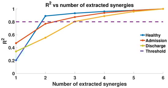 between the acquired EMG signal and the reconstructed one. The number of synergies N extracted from the EMG signal is the minimum value that returns at least equal to ([15]). More in detail, in order to select the minimum number of synergies N, suitable for a complete representation of the recorded EMG signal , the sets of muscle synergies were extracted for each subject with N ranging from 1 to 6 in order to identify the minimum number of synergies for which the condition is satisfied. At the end of this analysis, the mean value of synergies N on all the patients was considered, in order to obtain comparable synergy sets.